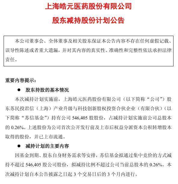 12月21日,皓元医药(688131)发布公告,股东苏民投君信(上海)产业升级与科技创新股权投资合伙企业因基金到期和自身财务需求,计划在2025年12月26日至2026年3月25日通过集中竞价方式减持不超过55万股公司股份,约占公司总股本的0.26%。
