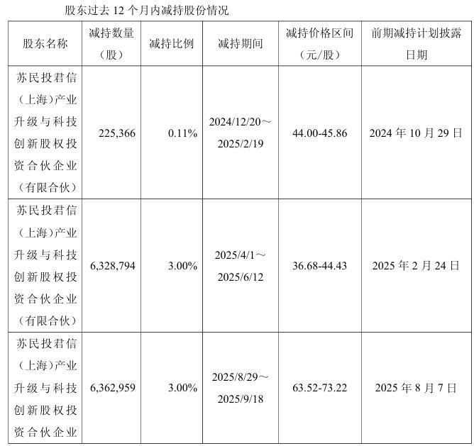 值得注意的是,近一年来,苏信基金已有三次减持动作,总计减持套现7.42亿元。分别是在2024年12月20日~2025年2月19日减持225,366股,占比0.11%,减持金额7142.27万元;在2025年4月1日~2025年6月12日减持6,328,794股,占比3.00%,减持金额2.53亿元;在2025年8月29日~2025年9月18日减持6,362,959股,占比3.00%,减持金额4.18亿元。